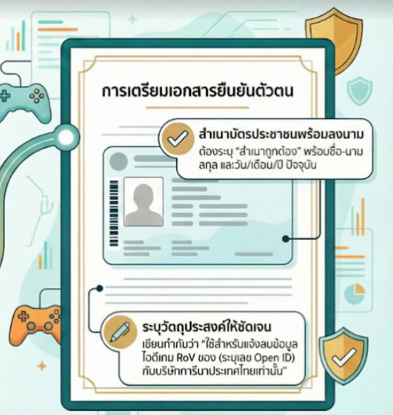 ในการขอลบไอดีเกม โปรดเตรียมเอกสารเพื่อยืนยันความเป็นเจ้าของบัญชีดังนี้ค่ะ