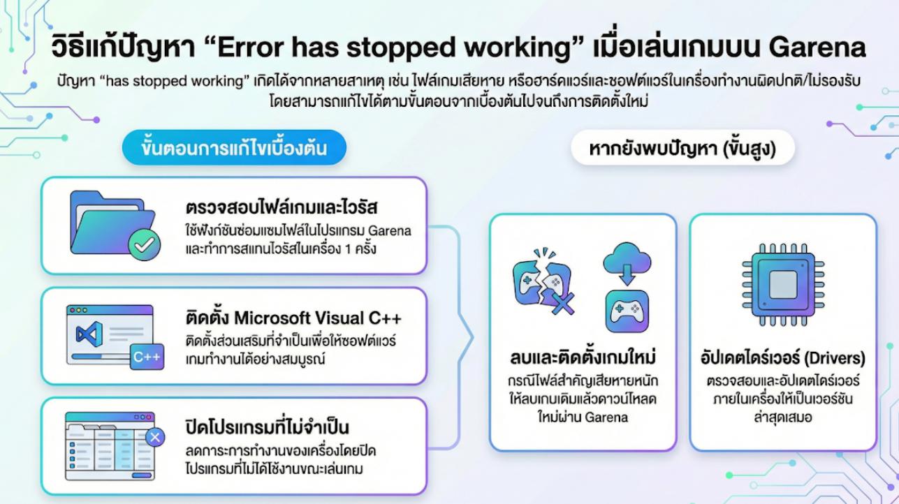 สำหรับปัญหา has stopped working จะเกิดได้หลายสาเหตุเช่น ไฟล์ตัวเกมเสีย หรือ Software , Hardware ทำงานผิดปกติหรือไม่รองรับกับระบบ
