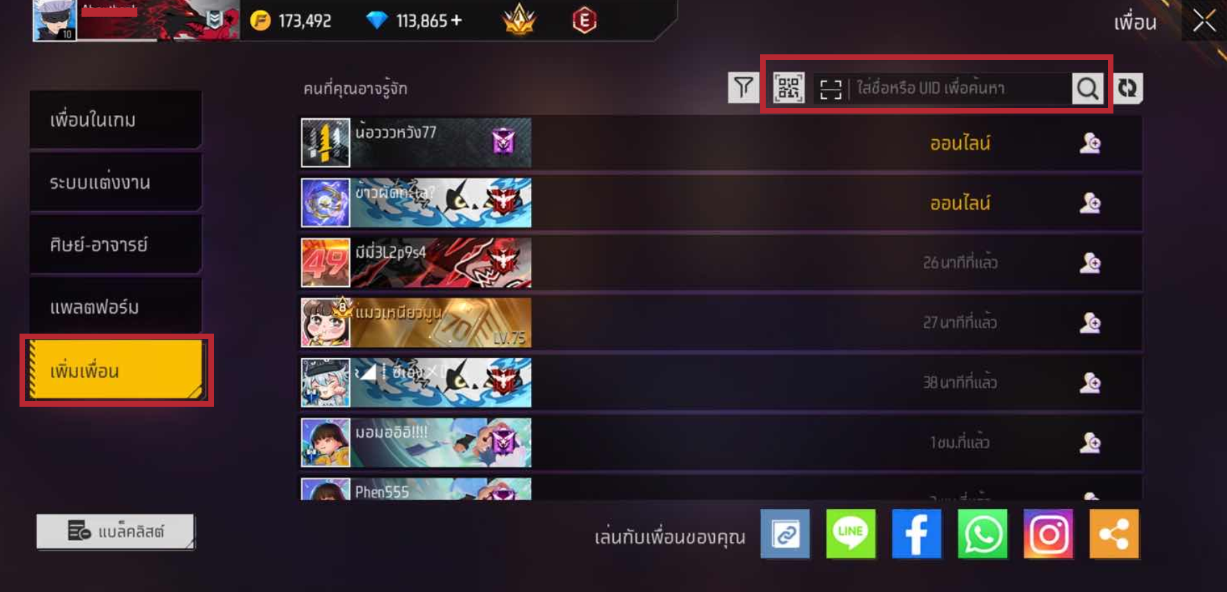 2. เลือกแถบเพิ่มเพื่อน และสามารถใน UID ของเพื่อนเพื่อค้นหา หรือสามารถให้เพื่อนสร้างรหัส QR เพื่อสแกนเพิ่มเพื่อนได้เลยเช่นกัน [กรอบสีแดงตามภาพ]